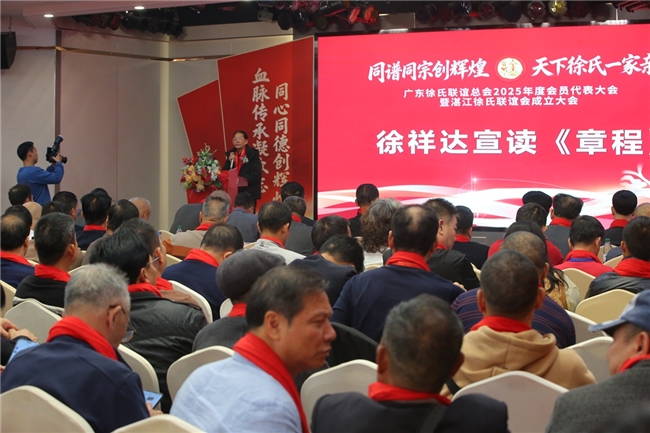 江河同源,枝叶同根。12月28日,以“同谱同宗创辉煌,天下徐氏一家亲” 为主题的广东徐氏联谊总会2025年度会员代表大会暨湛江徐氏联谊会成立大会在中国・湛江召开。来自广东各地及海内外的近420名徐氏宗亲代表齐聚一堂,共叙宗族情谊,共商联谊发展,宣布湛江徐氏联谊会正式成立。