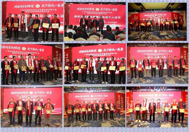 为表彰在徐氏宗族事业中作出突出贡献的个人与团体,大会特设颁奖环节。徐晓东、徐显参、徐思玉、徐尧、徐仁武等嘉宾分别为多批捐款宗亲及组织颁发荣誉证书,其中包括仙村下六坑村徐道政、徐鸿发,唐李村村民小组,草苏徐氏祠堂,江门徐氏宗亲联谊会、怀集县徐氏联谊会等数十位个人与二十余个团体,感谢他们为宗族联谊、公益事业的无私奉献。同时,大会还颁发 “无私奉献奖”,徐显参、徐文枢、徐剑峰等个人及丰顺埔头徐氏宗祠、广州市黄埔区宏岗村徐氏宗祠等团体获此殊荣;深圳财富集团潖江马邈祖徐氏联谊会、湛江市徐氏联谊会等集体与相关个人则获 “先进集体牌匾” 及 “先进个人证书”,进一步凝聚宗亲力量,激发参与热情。